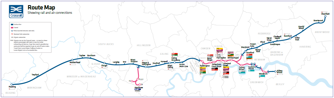 Crossrail is a major programme to run new, direct rail services between Reading and all passenger terminals of Heathrow Airport at the western ends of the railway, through a new underground section beneath central London to Shenfield in Essex and Abbey Wood in south-east London at the eastern ends.