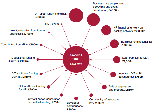 Notes 1 Cost in £ millions, includes £750 million contingency loan announced in December 2018. Excludes the cost of the rolling stock and depot. 2 GLA = Greater London Authority; DfT = Department for Transport, TfL = Transport for London; NR = Network Rail; HAL = Heathrow Airport Limited. 3 Precise levels of funding from some sources, such as sale of surplus land and property may be subject to change. Source: National Audit Office analysis of departmental information |