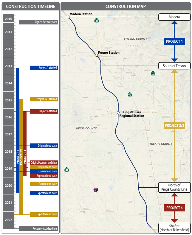 The Authority approved the start of construction in the Central Valley in 2013 despite knowing that moving forward was likely premature from a planning perspective and thus carried significant risks for unknown costs. According to its chief engineer, the primary factor in the Authority's decision to execute a construction contract in August 2013 was to meet deadlines for project completion and spending of funds under the terms of its 2010 grant agreement with the federal government. The agreement provided $2.6 billion for the project under the Recovery Act. Because the purpose of the Recovery Act was to create and preserve jobs and revitalize state and local economies, the agreement required that the Authority complete the Central Valley construction by 2017.2 In coordination with the federal government, the Authority determined that it needed to begin construction as soon as possible to meet that deadline. Therefore, the Authority executed its first construction contract in August 2013 and authorized the construction contractor to begin work in October 2013. Figure 6 on the following page details the three projects currently underway-all of which are funded in part by federal money-and provides a timeline of Central Valley construction.