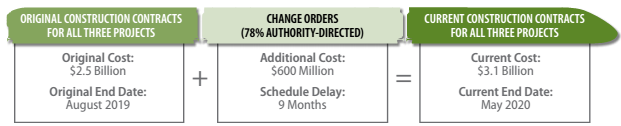 The Authority did not complete many critical planning tasks before beginning construction, which ultimately resulted in significant delays and led to increased costs. Because the Authority's planning was incomplete, it has used change orders to direct its contractors to perform additional work and to compensate them for delays. Quantifying the total cost of the change orders resulting from the Authority's insufficient planning is difficult, largely because the Authority's change order summaries do not show which changes stemmed from the early start of construction. However, the majority of the change order costs relate to risk areas that the Authority had identified but not effectively quantified when it decided to move forward with construction. Some of these risks, such as not securing the property on which it intended to build, directly led to cost overruns and project delays. In other instances, the Authority did not sufficiently account for the costs arising from issues it knew it would eventually need to address, such as relocating utility infrastructure from project sites and addressing the concerns of external stakeholders. At the time, it indicated that it did not have the information or finalized agreements it needed to plan or budget for the mitigation of these issues. Figure 7 on page 27 summarizes the total impact that executed change orders have had on the three current construction projects in terms of cost and delay. |