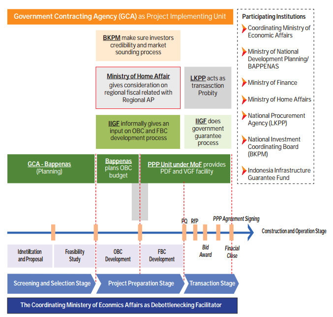 Directorate for PPP and Financial Engineering (KPSRB) Bappenas will facilitate GCA in project selection, identification and preparation. This directorate will ensure that the PPP project is in line with PPP planning regulation and national development plan and policies. Another function of Bappenas is to make sure that the project plans are executable in the future.