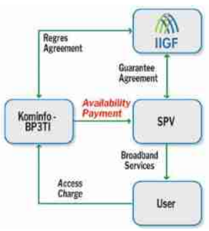 | Project Status: Project is currently under construction Investors : Consortium of PT. Mora Telematika Indonesia, PT. Infrastruktur Bisnis Sejahtera, PT. Inti Bangun Sejahtera, PT. Smart Telecom Financier : Syndication of PT. Bank BNI ICBC Indonesia, Bank Papua Bank Maluku Malut and Bank Sulsebar Equity Portion : The equity portion of this project is 20% of project cost. Indicative Government Support & Guarantee: Payment mechanism: Availability Payment (AP). Government guarantee by IIGF Commercial Date Operation (COD) : 29 September 2018 | Indicative Project Structure | |