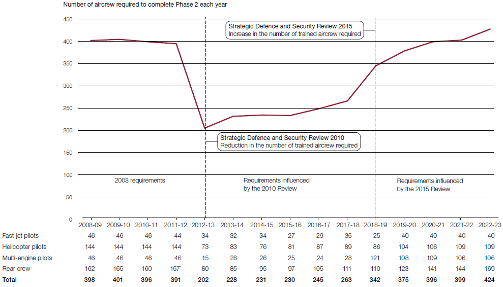 1.5 Changes introduced by the Strategic Defence and Security Review 2010 (2010 Review) decreased the number of aircrew required, resulting in a 48% (189) fall in the aircrew who needed to complete Phase 2 training in 2012-13. This followed certain aircraft being removed from service and the retirement of others earlier than expected.
