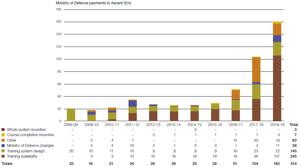 1.16 The Department pays Ascent for designing the Phase 2 training, introducing the system and managing availability. In 2015, the Department had forecast the MFTS would cost £3.2 billion over the 25-year contract. From the start of the 2008 contract to 2018-19, Ascent had received £514 million from the Department (Figure 6). In 2018-19, it received £107 million for ensuring training courses were available, with the required aircraft, simulators and instructors in place for each course. This is almost three times the £36 million Ascent received in 2017-18, which reflects, in part, that more MFTS courses are being provided.