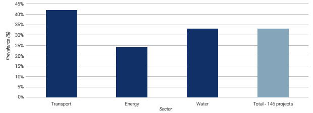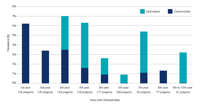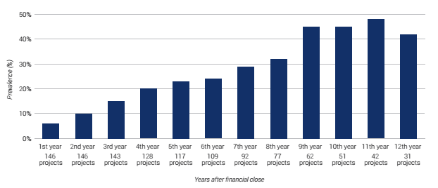 Had the same set of projects been used for each year after financial close, Figure 2 would have been cumulative. A different set of projects is used for each year (year N) after financial close as not all of the projects have reached year N at the time of completing this study. The prevalence drops off in later years due to the different set of projects.