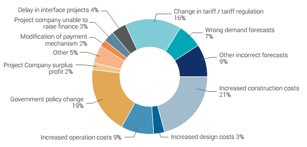 The causes of renegotiation in our study were varied. In 17 cases it was due to increased costs (two during design, 10 during construction and five during the operational phase). Although increased construction costs and increased operation costs are termed as causes of renegotiation, in reality they were the consequences of an underlying cause which has not been identified during the study. The underlying cause which led to increased construction or operation costs is, at times, related to the Procuring Authority's breach of, or non-compliance with, its contractual obligations (e.g. failure to complete land acquisition, grant site access, secure third party approvals, etc.). Another 18 were due to a change in regulation or policy change, split evenly between regulation and policy changes. Four were due to incorrect demand forecasts, including the Queen Alia International Airport Expansion Case Study, where the actual volumes were higher than predicted. The remaining instances were due to external factors, such as delays in gaining access to worksites.
