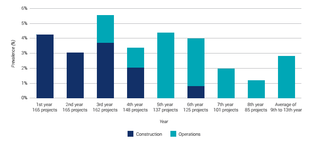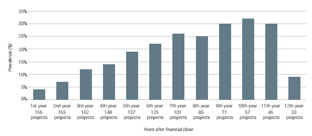 Had the same set of projects been used for each year after financial close, Figure 8 would have been cumulative. A different set of projects is used for each year (year N) after financial close, as not all of the projects have reached year N at the time of completing this study. The prevalence therefore drops off in later years due to the different set of projects being included.