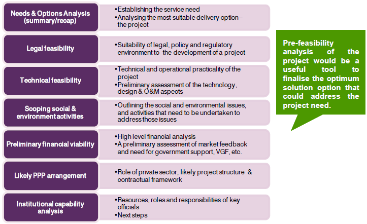 A pre-feasibility analysis of the project can be used as a tool for evaluating the options and deciding which one is best. The objective of a pre-feasibility study is to provide first-hand information on the feasibility, at first sight, of a project and the optimal manner of implementing it. The indicative content of a pre-feasibility study report is set out in the diagram below: