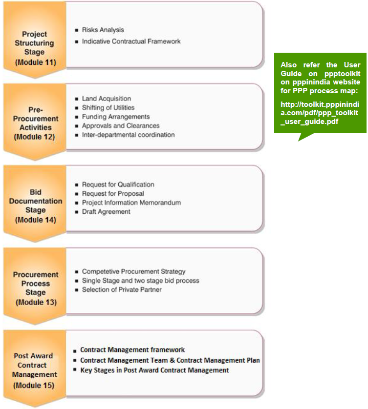 Among the various modes of implementation, PPPs are gaining traction, albeit with a need to comprehensively address the concerns of all the stakeholders involved. Based on the experiences of developing projects under the PPP framework, experts in the field have distilled the process that need to be adopted in identifying, structuring, selecting the private partner and the activities post-selection of the private partner to ensure successful project implementation.