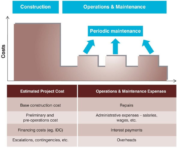| The other component of cost is the O&M cost. This normally includes direct costs and overheads. Overheads reflect the expenditure for administration, management, risks and profits. Direct cost is the cost of inputs such as labour or material, which is determined by the cost of construction and the economic and market conditions. |