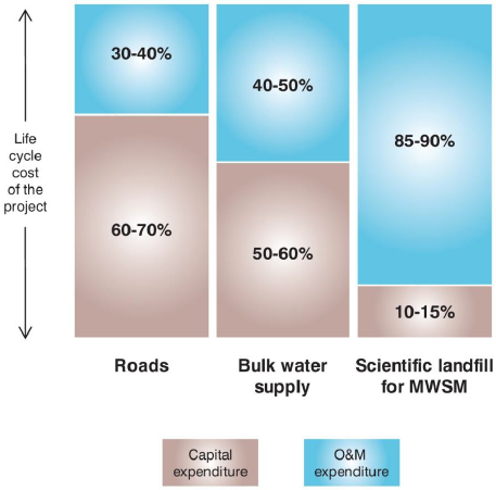The figure below sets out an indicative share of the capital and O&M expenditure during the project life cycle period, for development of roads, bulk water supply systems and the development of scientific landfill projects.