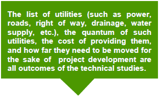 Project development requires availability of certain core/trunk infrastructure in place, at least up to the battery limits of the project site. Land is the foremost requirement for any project. The project site and acquisition of land that is free of encumbrances is the responsibility of the Government. The technical studies list out all the approvals and clearances that have to be obtained for implementation of the project. It also lists the utilities/ancillary infrastructure that may be required for the project. |