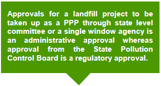 The types of approvals largely fall under the following heads: 1. Administrative approvals: Administrative approvals for a project are the prerogative of the public entity. 2. Regulatory Approvals from Boards/Agencies/Authorities: Either the public entity or the private partner can obtain the regulatory approvals, depending upon the stage in the project development process, entity best suited for obtaining the approvals and the statutory requirements of the approvals/ clearances. |