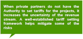 | One of the key challenges in a PPP project is to define the most appropriate tariff. Tariffs for services must ideally cover the full cost of service provision, including capital cost, operations and maintenance expense, and the cost of negative environmental and social externalities. |