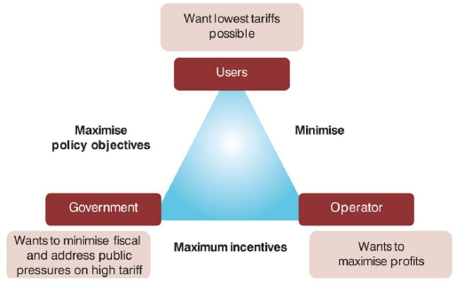 The level and structure of tariffs must ideally offer incentives to service providers to minimise costs, and to customers to consume services efficiently. When tariffs are inadequate, the financial feasibility assessment needs to identify a plan to improve cost recovery, and identify sources of financing the full cost of service provision. Different stakeholders have different expectations from the tariff. A framework explaining the expectations of three key stakeholders is provided below.