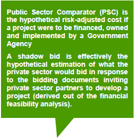 | Steps in Initial Value Proposition of Projects Test: 1. Calculate the Public Sector Comparator (PSC) for the project 2. Check whether the PSC is greater than the shadow bid 3. If the PSC is greater than the shadow bid, there is value in developing the project through a PPP framework | |
