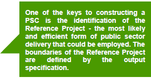A PPP reference bid is a hypothetical private party bid which meets the defined output specifications (the same as that used in constructing the PSC). It is also known as a shadow bid. In this case, the costing of the output specifications should be carried out from a private party's perspective. Comparing the net present cost of a risk-adjusted PSC model with the net present cost of a risk adjusted PPP reference model to the public entity/public finances enables an assessment of whether service delivery by the Government or by a private party yields the best value to the public entity.