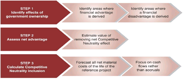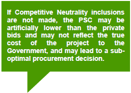 | Competitive Neutrality removes the net competitive advantages that would accrue to a Government business by virtue of its public sector ownership. The purpose of including this component is to allow a like-with-like value assessment between a PSC and private bids. |