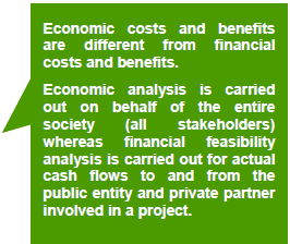 | While the public entity also undertakes an assessment of the financials, the investment rationale goes much beyond project boundaries and captures the cost and benefits to society at large. In fact, such analysis is usually undertaken to ascertain whether an economic case exists for an investment decision. The economic cost/benefit analysis is also termed as the economic analysis of a project. Economic viability analysis includes an assessment of the economic benefits from, and the economic costs of, a project. The difference of these (benefits and costs as mentioned above) in present value terms, is the net economic benefit to society. Economic analysis is an integral part of project development studies and is normally undertaken before carrying out financial feasibility studies. |