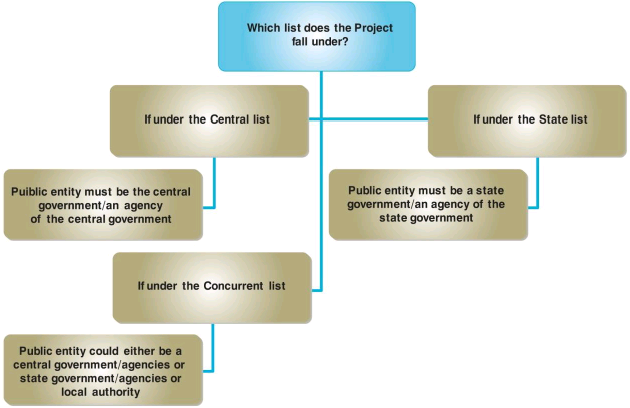 The Seventh Schedule to the Indian Constitution sets out the Union list, the State list and the Concurrent List, which provides clarity on the authority of the Central and State Governments to undertake/initiate develop projects in specific sectors. The composition of the Union list, State list and the Concurrent list is given in the Annexure 9 of this module.