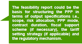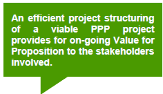 | The key tenets of project structure include - the scope of the PPP, the appropriate PPP mode, the financial scheme, how costs can be recovered, the duration of the PPP, and the overall operating framework. These tenets serve as key inputs for developing a PPP structure emanate from a range of studies or investigations that a public entity undertakes prior to configuring a structure. |