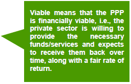 Typically, it is assessed whether the project is viable on its own - i.e., without any support from the public entity (financially free standing project).