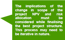 | Reducing the scope may increase the NPV from a private sector perspective because the scope reduction may imply that costs will be reduced without a significant impact on the revenue potential. The scope reduction may also imply that the risk profile is reduced because it no longer includes, say for instance, the construction and maintenance risk of the excluded asset. In this case the consequence of the scope reduction is a financially viable project from a private sector perspective even through this may result in increased public sector risk exposure and a fiscal burden. |