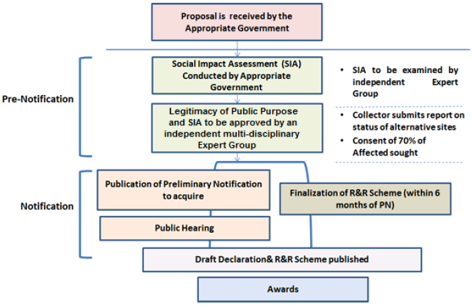 As set out in the flowchart given above, the entire process of land acquisition could be dealt in two stages; viz. (i) Preliminary Notification Stage which pertains to land acquisition and (ii) Notification Stage which involves Land Acquisition and the Rehabilitation & Resettlement (R&R) Scheme.