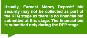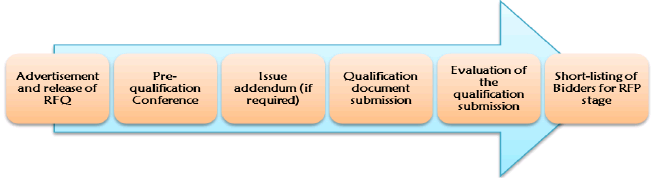 | The RFQ process is carried out to short-list and pre-qualify applicants who will be required to submit financial bids at the RFP stage. The objective is to identify experienced bidders who have the requisite technical and financial capacity to undertake the project. Through this process, the public entity weeds out unsuitable firms and stimulates qualified firms to prepare a good proposal. |