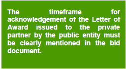| The Letter of Award is the decision notice sent out to the successful bidder by the public entity on completion of the evaluation and selection of the preferred bidder. There may be certain conditions such as the formation of a special purpose vehicle/project company to implement the project, the submission of a bank guarantee towards performance security, the payment of an upfront payment etc. which the successful bidder may have to fulfil before the parties enter into a contractual relationship. These conditions, along with the timeline for execution of the agreement, should be mentioned in the Letter of Award, which the successful bidder must fulfil before coming forward for execution of the Agreement. The Letter of Award has to be acknowledged by the successful bidder within the period stipulated. Failure to do so, or failure to execute the agreement within the time period stipulated in the Letter of Award or any extended period, permits the contracting Authority to forfeit the bid security and cancel the award. |