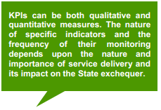 | What are Key Performance Indicators (KPIs)? KPIs are metrics to track the progress or performance of a project in terms of its service objectives. They should be defined in such a manner that they describe the desired output or performance levels and not the means or methods of achieving such output. The process of developing KPIs begins at the procurement stage of the PPP project lifecycle when the contract manager/team provides a support role to the procurement team in developing the KPIs. At the tendering and contracting stage, the performance requirements are identified and defined. Later, the KPIs are developed and detailed. At the next level, area-specific KPIs are defined. The reporting requirements for the KPIs are also detailed at this stage. Indicative KPIs: • Service Quality: Quality of Road, 24x 7 water supply • Financial Efficiency: Average cost of ambulance trip, average cost per water connection • Process Related: Arrival processing time at airport, average connection time Source: Knowledge Series, Training of Trainers Curriculum, PPP, Module II - Project Analysis and Structuring, Department of Economic Affairs, Ministry of Finance, Government of India |