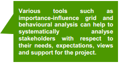| The three tools, namely communication needs assessment, importance-influence grid, and behavioural analysis, which can help systematically analyse stakeholders with respect to their needs, expectations, views and support towards the project is discussed herein below. |
