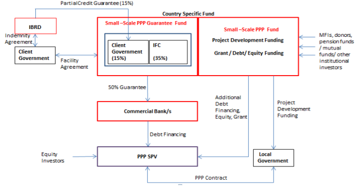 • Funding vehicle aimed at small sub-national projects: Rather than specific project level investments, the World Bank Group could initiate greater thinking around wholesale investing such as through urban infra funds or support vehicles with grant and non-grant products such as loans, guarantees, etc.; IFC or the World Bank can look at contributing to these funding vehicles within a practical and flexible framework in order to leverage private financing. The IDB concept on country specific SIFs could be one way to approach this. Another way to do this is through country specific guarantee / support facilities established exclusively for small-scale subnational PPP projects: the guarantee window can be backed by the client country / state government and IFC, with both together taking the first loss up to 50% or less (the proportion could be 15% client country and 35% IFC), with the client country portion backed up by a Partial Credit Guarantee (PCG) instrument of the World Bank. Further detailed design work is recommended to place the general design in context. However, apart from the guarantee instrument, windows for project development funding and other support instruments would be required. A multi-product small-scale PPP facility is a good option that may work for a variety of projects. A general schematic approach is suggested in Figure 6 below. However, this would need to be supplemented by both upstream sector and institutional work as suggested earlier in order to structure and bring good projects into the pipeline. In addition, it would help to look at funding innovative small projects through a "challenge fund" window in order to encourage promising new project structures that meet key benchmark criteria.