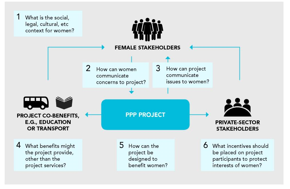 This project-centered tool recognizes that PPPs often fail to examine or address the issues relevant to all project stakeholders, usually women. The set of questions underpinning this tool is therefore designed to help project planners think through how to improve gender equality in PPP projects. It provides a set of questions to be asked in relation to five key areas surrounding the PPP project (see Figure 4). It is hoped that these questions will help ensure more gender-sensitive PPP projects, by uncovering information and issues that will translate into different project designs and more nuanced drafting of project agreements.