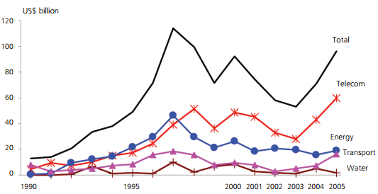 In 2005, investment commitments to private infrastructure projects in low- and middle-income countries grew by over 30% against 200 to almost $96 billion. Figure 1: Investment Commitments in Infrastructure Projects with Private Participation in Developing Countries by Sector, 1990-2005