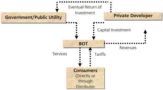 BOT and similar arrangements are a kind of specialized concession in which a private firm or consortium finances and develops a new infrastructure project or a major component according to performance standards set by the government. Figure 8 illustrates the BOT contract structure.