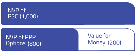 The difference between the NPV of the Privatization option less the NPV of the PSC is the value for money potential achieved by undertaking the Privatization option, as shown below. If the Privatization option provides equal or better NPV as compared to the public procurement option, then a Privatization procurement can be pursued.