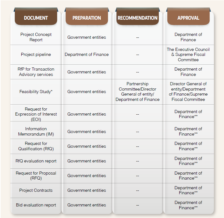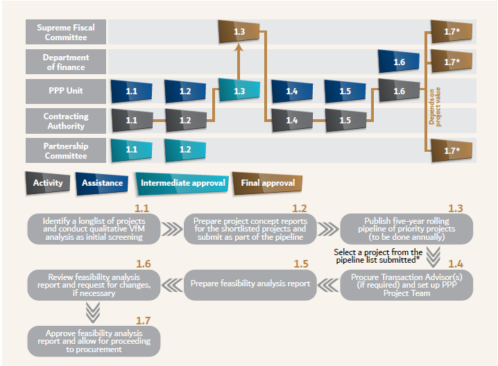 *The approval process for the Feasibility Study is contingent on project value: whilst they are always prepared by government entities, for a project with a value lower than AED 200 million, the Partnership Committee recommends the study for approval, and the Director General of the entity provides the approval; for projects with a value between AED 200 and 500 million, the Director General of the entity recommends the document for approval and the Department of Finance provides the Final Approval; and, for projects with a value greater than AED 500 million, the Department of Finance recommends the document for approval and the Supreme Fiscal Committee provides the Final Approval