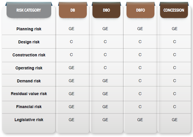 An illustrative table providing an allocation of the risk under Design and Build (DB), Design, Build, and Operate (DBO), Design, Build, Operate, and Finance (DBFO), and Concession contracts is provided below:
