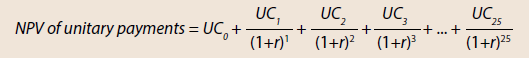Where UC is the unitary charge/availability payment, r is the discount rate, and the concession period is 25 years. If the discount rate is higher, the denominator in the above equation becomes bigger. Hence, the NPV becomes smaller. As payments in the PPP model are over the whole project term, the benefit of discounting are more apparent in a PPP model than in a traditional procurement model, wherein the payment for construction is done during the construction period only. |