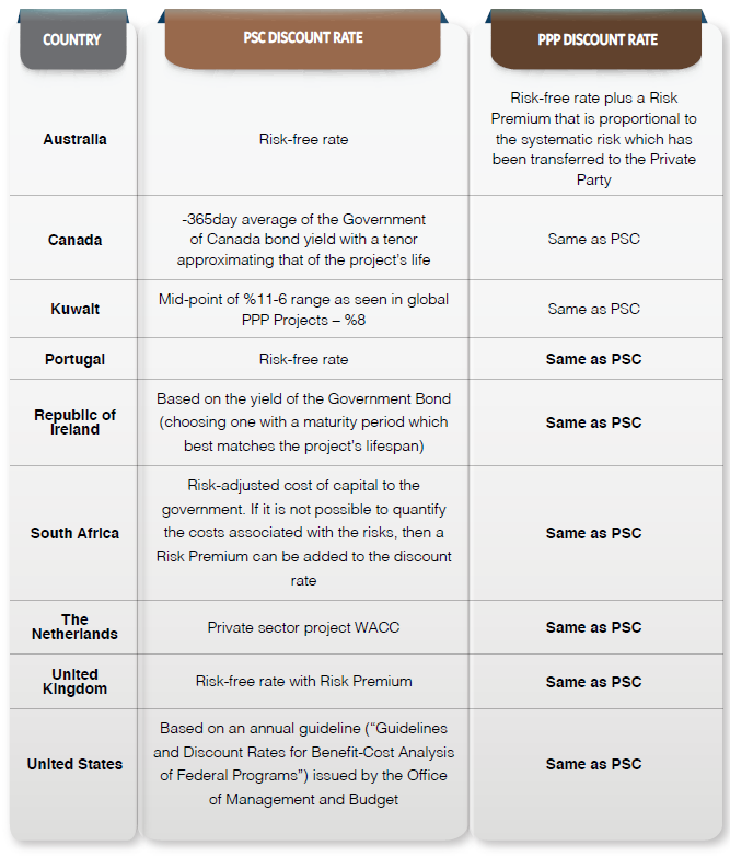 3. Where the risk-free rate is utilised for the PSC and the risk-free rate plus a project Risk Premium is used for the PPP - as in Australia.