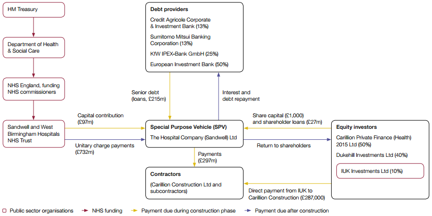 1.6 Carillion was chosen to build Royal Liverpool by the Royal Liverpool University Hospitals NHS Trust (the Liverpool Trust), and to build Midland Metropolitan by the Sandwell and West Birmingham Hospitals NHS Trust (the Sandwell Trust), following open competitions. It had a dual role in the two hospital PFI schemes, as the lead construction contractor and as a major shareholder in the private companies responsible for the projects. Figures 2a and Figure 2b on pages 16 and 17 show the structures of the two PFI schemes including the PFI companies (or Special Purpose Vehicles), which raised finance from debt and equity investors to pay for each hospital's construction. The investors' returns were expected to come from monthly 'unitary charges', which the Trusts would start to pay once the hospitals opened.