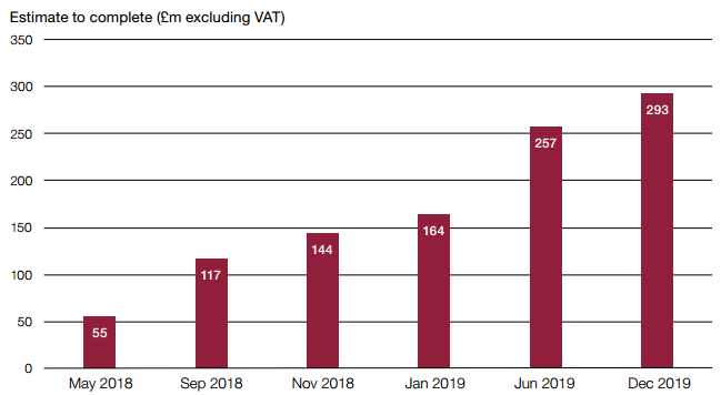 2.26 Estimates of the cost of completing the hospital continued to rise through 2018 and into 2019 (Figure 6). By January 2019, following further work by Arup and others, the Trust estimated the completion cost had risen to £164 million. Had this estimate been used it would have reduced the contractual compensation to zero. By December 2019 the completion cost estimate had risen to £293 million, including the current estimated cost of fixing the cladding (Figure 6 and paragraph 1.19).