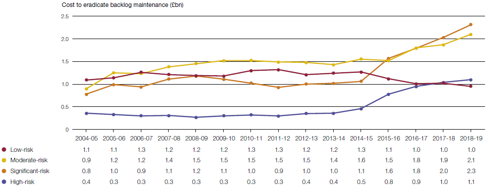 1.4 Backlog maintenance is a measure of how much spending is needed to restore NHS buildings to an appropriate standard. An appropriate standard includes the physical condition of the estate, as well as compliance with fire safety and health and safety standards. Backlog maintenance is classified into four categories: low-, moderate-, significant- and high-risk (Figure 2). The total cost of backlog maintenance estimated in 2018-19 is £6.5 billion. This comprises: £1.0 billion for low-risk maintenance; £2.1 billion for moderate-risk maintenance; £2.3 billion for significant-risk maintenance; and £1.1 billion for high-risk maintenance.