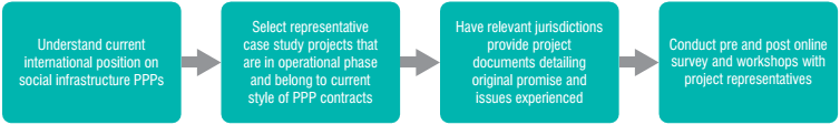 The project began with a systematic review of the literature on social PPP projects and comparable traditional projects. The literature review was conducted on three key areas: a VFM outcome assessment including time and cost performance, service outcomes and benefits, and user experience and satisfaction including identification of factors contributing to the positive and negative user experience. The review of literature contributed to the development process for the workshops (focus group discussions) and surveys. This process included developing questions for workshop discussions and surveys, recruiting workshop participants and selecting venues, and is illustrated in Figure 3.