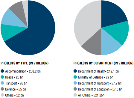 Figure B.2 provides a good representation of how in recent years, the UK Government's use of the PFI and PF2 models has slowed significantly, reducing from an average of 55 contracts executed each year in the five years to 2007-2008 to only one in the financial year of 2016-17.34 The use of current PFI model was cancelled in 2018 by the UK Government (House of Commons Committee of Public Accounts, 2018). Figure B.3 represents PFI usage in different UK Government departments.