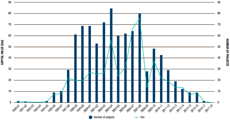 Figure B.2 shows UK PPP contracts from 1990 to 2014. Under a typical PFI deal, the public sector enters into a long-term contractual agreement with private sector companies, which undertake to design, build, operate and maintain an asset. Currently, in the UK there are around 700 operational PFI and PF2 contracts with a capital value of around £60 billion (House of Commons Committee of Public Accounts, 2018). Annual charges for these deals amounted to £10.3 billion in 2016-17. Even if no new PPP contracts are entered into, existing contract costs will continue until the 2040s, by which time will amount to £199 billion (HM Treasury, 2017).32