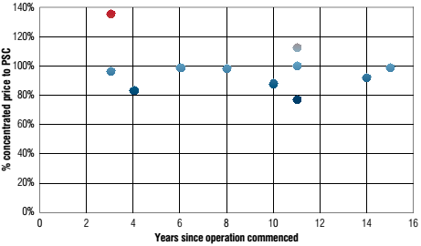 Figure D.5 details the ratio of the contracted price of the PPP project compared to the PSC over time for the 12 case study projects. Some important observations from this figure are that: only two projects exceeded governments estimate - in all cases government had strong bids from a competitive market so it can only be assumed that the market price was the right price for the service outcomes specified. The one project that exceeded the PSC by some margin also achieved a very high satisfaction rating. Overall, it appears that the PPP market has operated consistently over the last 15 years with value being achieved. There is no indication of price creep over time. It is concluded that the PPP market is functioning as a mature market.