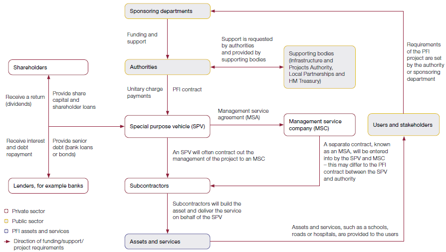 Figure 4 Illustration of the key stakeholders in a typical private finance initiative (PFI) project Every PFI contract involves a multitude of public and private parties
