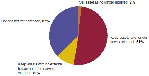 3.8 The ownership of assets at expiry will be dictated by the contract. Assets will either fully or partially transfer to the public sector or remain with the private sector. If the assets return to the public sector, authorities have four options: sell the asset if the service is no longer required, tender out the service element to a new private sector provider, operate the service in-house, or do nothing.37 Situations which require continuity of service, with the assets reverting to public sector ownership, represent the greatest risk to government. Our survey highlights that this group represents the largest share of the outstanding contracts (Figure 12 on page 37).